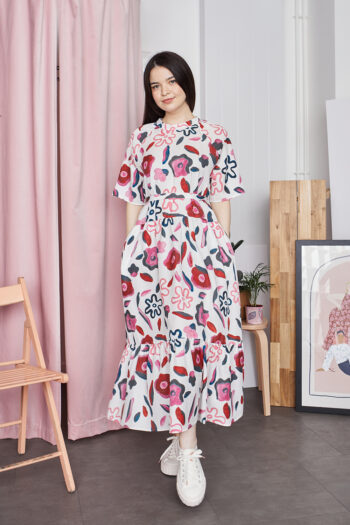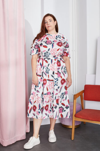 Hannah flower print knitted dress with ruffle details starting from neck line and going all the way down the left sleeve. Unique print, slightly loose fit and 3/4 length sleeves. Developed and made in the UK. This dress is available in sizes Small and Medium. It will no longer be restocked as it was a limited edition.